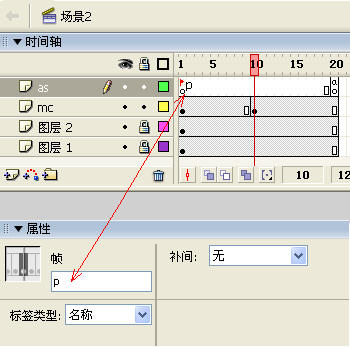注意看看,場景2【AS】圖層的第20幀上有一個小紅旗標志,還有一個小寫子母“p”,這是一個名稱為“p”的幀標簽。