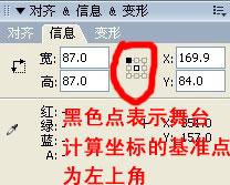 那么由此可見,FLASH軟件操作界面中的計算坐標的方式和AS并不一樣,但是起碼來說我們現在能找到一個共同點:也就是不管舞臺中信息面板中設置元件坐標計算的基準點是左上角還是元件的中心,AS計算坐標的基準點始終是元件的十字心。那讓他們的坐標一樣用很簡單的一個辦法就是把你建立的元件的注冊點都設置成左上角,然后再信息面板的九宮格也點選左上角,那么AS計算的十字注冊點和軟件操作界面計算的元件坐標的基準點為同一點,那么他們的結果就一樣。