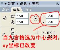 同理,如果你建立的影片剪輯的十字注冊點在元件的中心,那么信息面板的九宮格也點選中心點,那么AS計算的十字注冊點和軟件操作界面計算的元件的中心點為同一點,那么他們的結果就一樣。