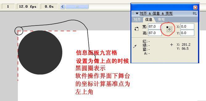 這時候我們發現舞臺的坐標立馬就變成了(x:43.5y:43.5),那么圓的寬和高都是87,它的坐標正好等于圓的一半。由此可以看出如果我們把信息面板的九宮格選為中間的那個點的話,那軟件操作界面計算坐標的基準點我們可以暫時理解為元件的中心(不完全是,現在你先可以這么理解),