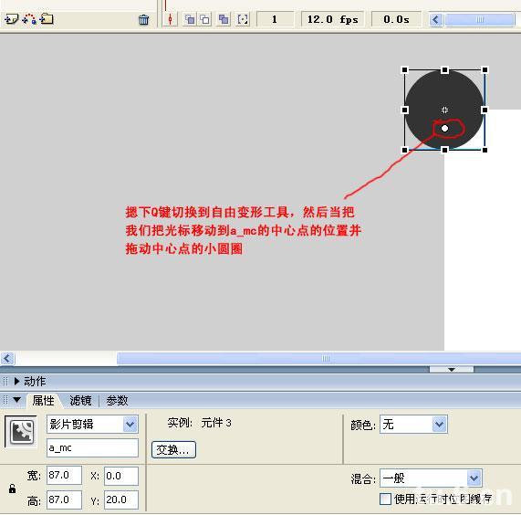 我們摁下Q鍵切換到自由變形工具,然后當把我們把光標移動到a_mc的中心點的位置并拖動中心點的小圓圈,我們發現當我們的小圓圈改變位置的時候,軟件操作界面下的X,Y坐標發生了變化: