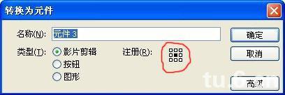 我們重新把這個元件打散,然后摁F8轉換為元件,元件的十字注冊點設為中心,實例名稱為a_mc,如圖所示: