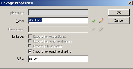這樣嵌入字體的工作就完成了,as3文件不同的地方在于沒有標(biāo)識(shí)這個(gè)東西了,那我們?cè)赼a.swf(就是上面的share.swf)里設(shè)置Classname為自定義的字體名字zhr_font,然后在Main文件里也設(shè)置成zhr_font的ClassName
