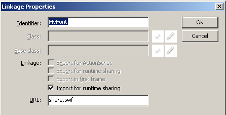 如果是as2的話,新建一個(gè)Fla文件share.fla,然后在庫里新建一個(gè)字體文件,然后設(shè)置他的標(biāo)識(shí)為MyFont,隨便選擇系統(tǒng)內(nèi)的一種字體,然后選擇linkage里的導(dǎo)出as,導(dǎo)出runtime sharing,導(dǎo)出第一幀,然后在url處填寫share.swf,然后編譯成share.swf