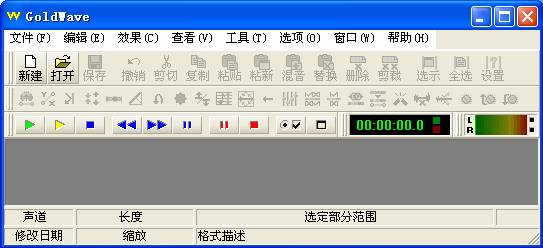 (3)在GoldWave中剪裁和編輯音樂我們已經知道了在Flash中可以導入的聲音格式主要是WAV和MP3的音頻格式,如果找到要做Flash MTV的歌曲很長,我們只需要其中的一部分。特別是初學者第一次嘗試做Flash MTV主要是為了掌握制作的技巧,最好選擇音樂的主要部分來做,可以節省完成作品的周期。下面我們就來學習將音樂文件進行部分截取和編輯的方法,在這方面應用的軟件很多,推薦大家使用Gold Wave 5.5。Gold Wave是一個功能強大的聲音編輯軟件,它簡單易學、容易掌握。制作Flash MTV時,利用它錄制聲音、編輯處理聲音是個不錯的選擇。我們先來認識Gold Wave,運行Gold Wave 5.5,如圖13-1-5 所示。