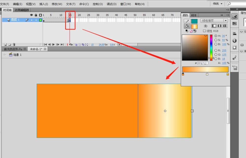 4、在時間軸的第15幀插入一個關鍵幀,然后將中間的高光通過漸變變形工具移動右側,然后通過顏色面板將兩邊的漸變色進行更改。