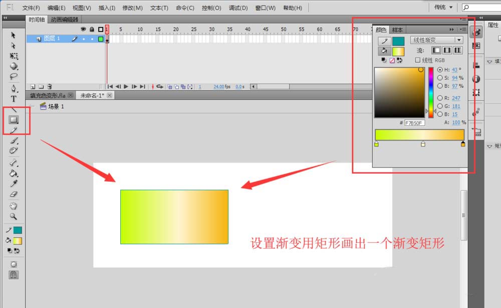 2、設置一個漸變填充色,然后選擇矩形工具,使用矩形工具來繪制一個漸變填充的矩形圖形出來。