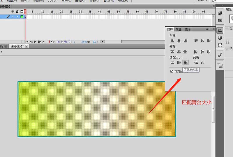 3、選中繪制的矩形圖形,打開對齊對話窗口,勾選與舞臺對齊,設置匹配舞臺大小,并水平中齊,垂直中齊。