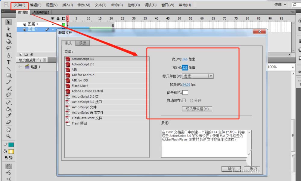 1、打開flash軟件,新建一個flash的項目,這里項目設置根據大小的需求進行設置,我這里需要長條的背景圖所以就設置了一個長條背景。