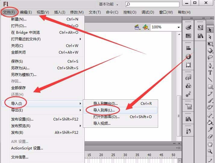 1、Flash窗口中,單擊文件---->導入---->導入到庫,導入一張背景圖片。