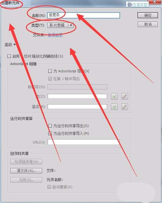 2、單擊“插入”---->“新建元件”,在出現的“創建新元件”對話框中,將“名稱”取名為“進度條”,“類型”為“影片剪輯”。