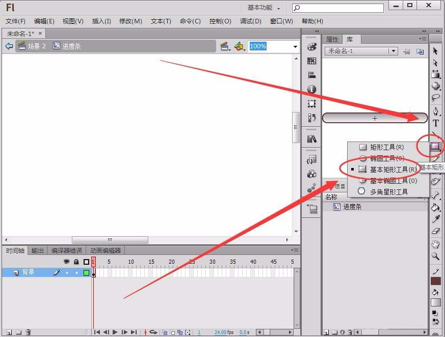 3、在“編輯欄”中按住“矩形工具”不放,在出現的下拉菜單中,選擇“基本矩形工具”,在“進度條”元件中,繪制一個圓頭矩形。