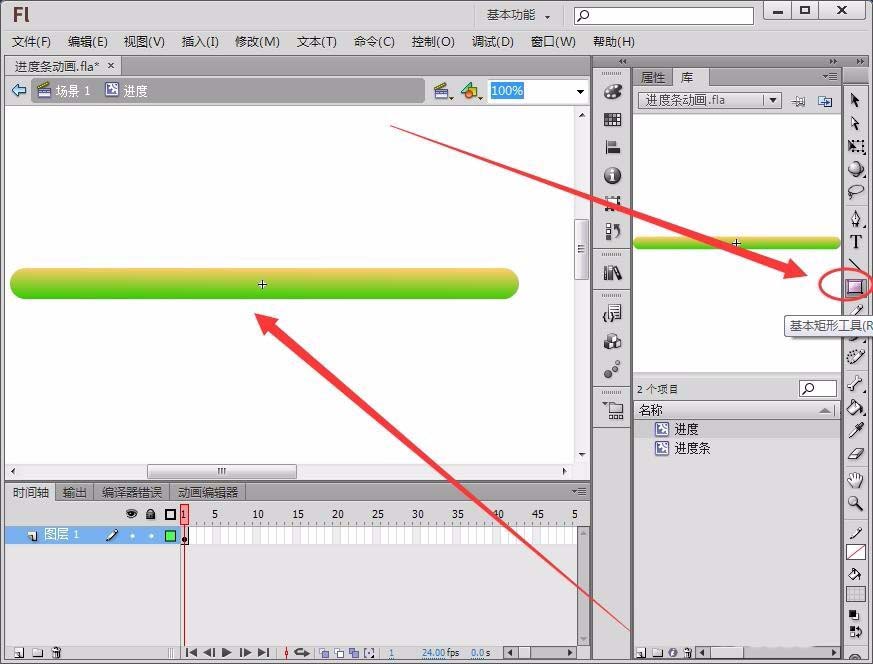 5、在“編輯欄”選擇“基本矩形工具”,在圖層的第1幀根據“進度條”的長度繪制一個圓頭矩形。