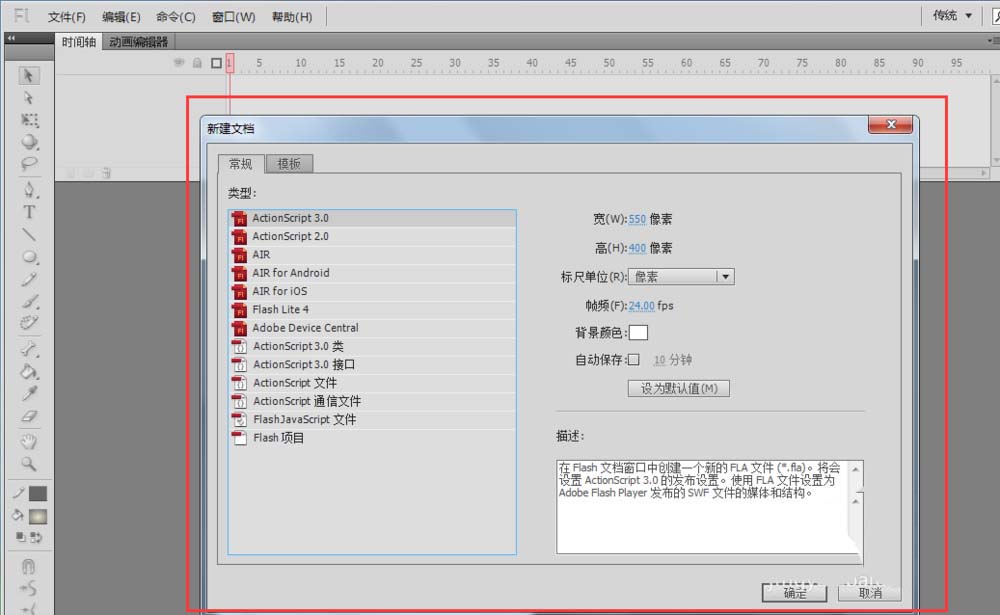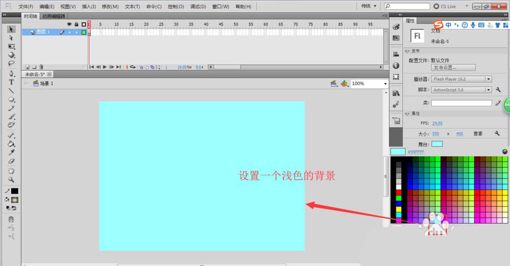 2、用“選擇工具”單擊一下flash的舞臺區域,屬性窗口會顯示關于文檔的屬性設置,我們為當前文檔設置一個淺色的背景。