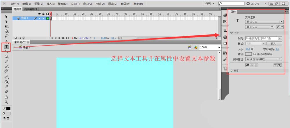 3、 選中左側工具欄中的文本工具,在文本屬性中先設置好有關文本輸入的一些參數。