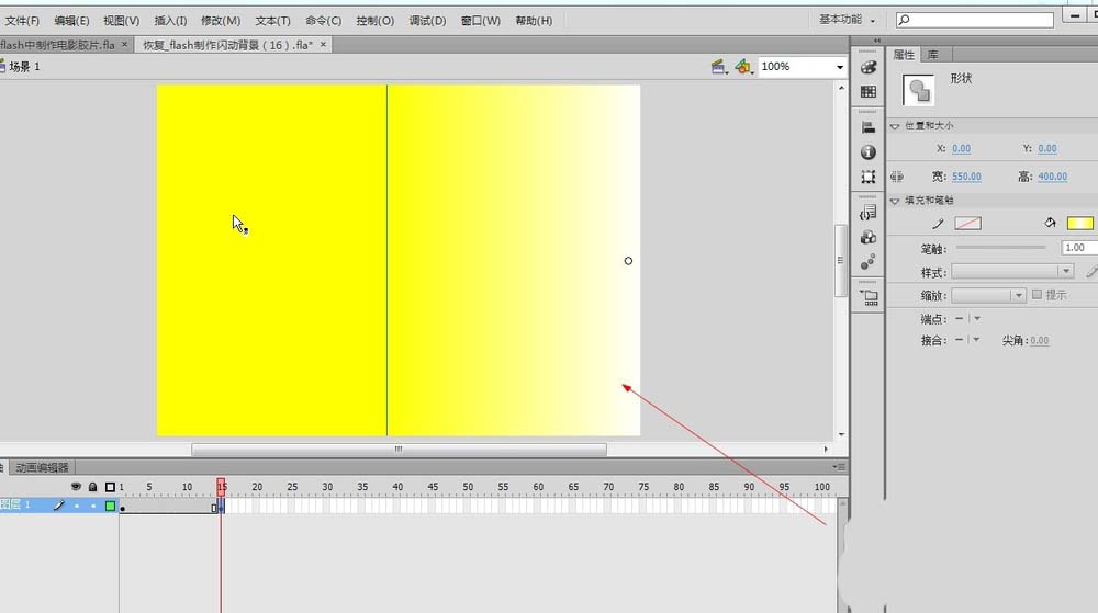 9、如圖所示,我們點(diǎn)擊選擇這個圖層的第1幀,之后依舊用這個漸變色變形工具,將這個漸變色進(jìn)行移動,移動白色部分到舞臺的左邊。