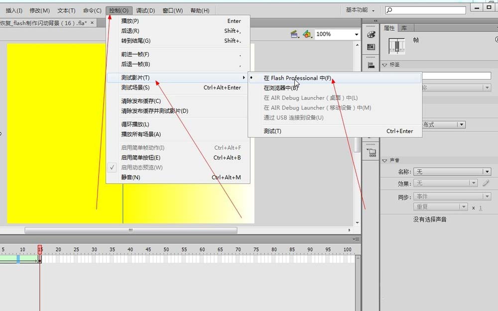 11、如圖所示,我們點(diǎn)擊箭頭所指的“控制”,之后在彈出的下拉列表菜單中,我們點(diǎn)擊箭頭所指的“測試影片”,之后我們依次點(diǎn)擊“在Flash Professional中(F)”,這樣就可以生成動畫了。