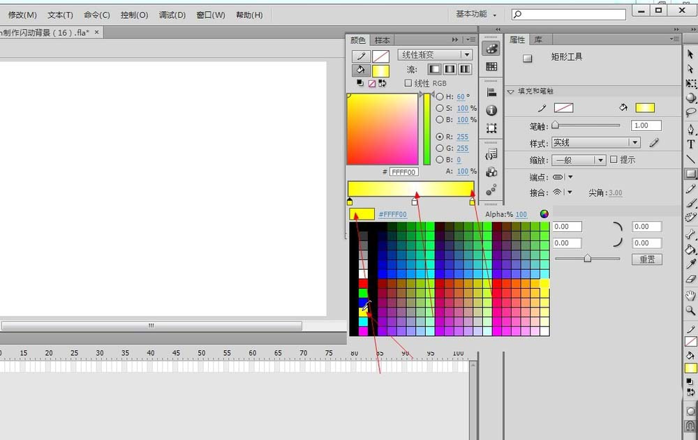 1、如圖所示,我們新建一個flash的文檔,之后我們點(diǎn)擊箭頭所指的矩形工具,之后點(diǎn)擊這個顏色按鈕,為這個矩形工具繪制的矩形選擇一個顏色。