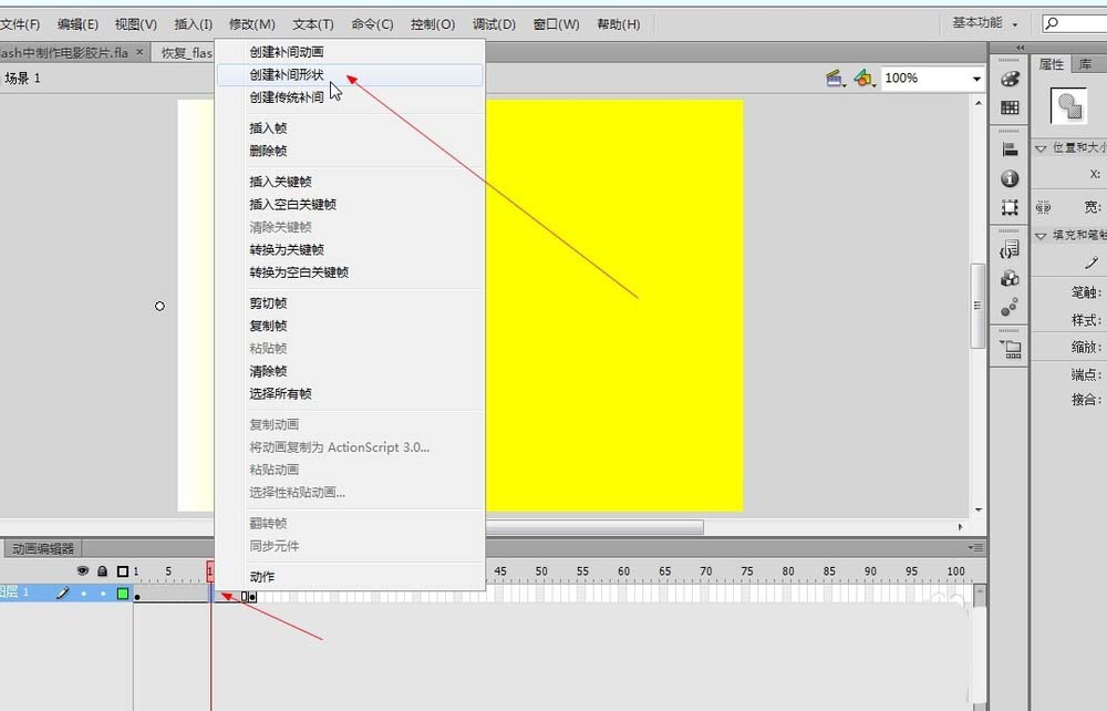 10、如圖所示,我們在這個第1幀到第15幀處鼠標(biāo)右擊,在彈出的上拉列表菜單中,我們點(diǎn)擊箭頭所指的“創(chuàng)建補(bǔ)間形狀”就可以創(chuàng)建一個形狀動畫了。