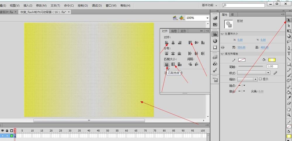 5、如圖所示,為了使得這個矩形和舞臺大小一樣,我們選中這個矩形,之后點(diǎn)擊這個對齊按鈕,打開對齊面板,之后勾選對齊面板中的相對于與舞臺那個框,這樣就是相對于舞臺了,之后我們點(diǎn)擊匹配高度和匹配寬度按鈕,就可以匹配出與舞臺高和寬一致的矩形了,之后我們再點(diǎn)擊下左對齊和上對齊,就可以讓這個矩形完全覆蓋到這個舞臺上面剛剛好了。
