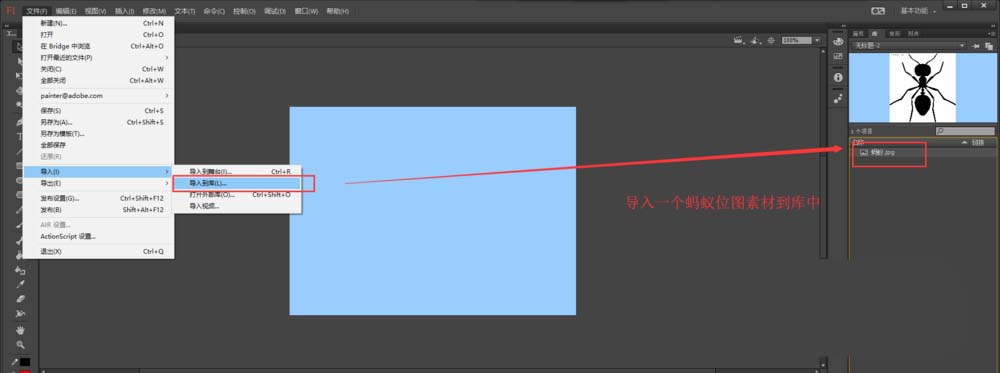 2、在文件菜單中找到導入命令,選擇導入到庫,然后將一個提前準備好的螞蟻位圖素材導入到flash庫中。