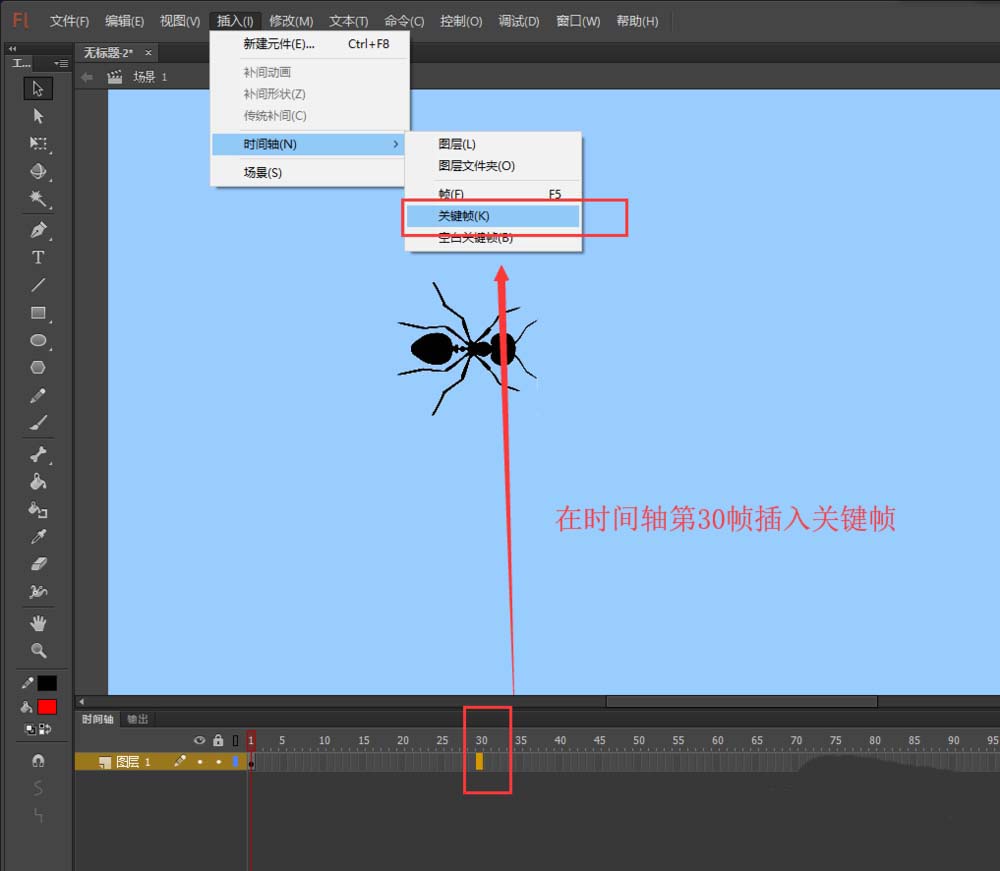7、在時間軸的第1到30關鍵幀之間右鍵鼠標執行“創建傳統補間”,來創建一個傳統補間動畫。然后執行控制菜單欄中的播放命令,就能看到一個螞蟻從畫布左側運動到右側的簡單動畫出來了。