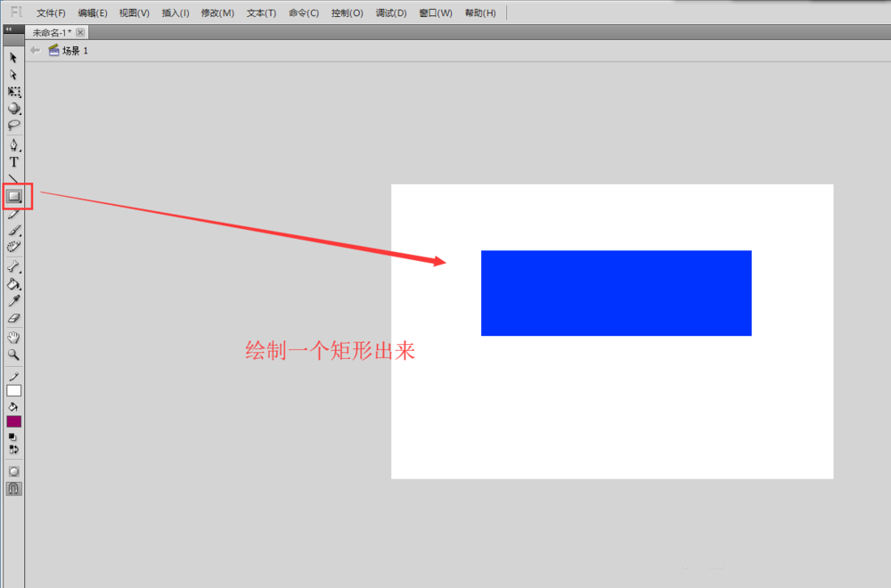 3、然后將鼠標(biāo)移動(dòng)到舞臺(tái)位置上,按住鼠標(biāo)左鍵進(jìn)行拖動(dòng),繪制出一個(gè)矩形圖形出來(lái)。