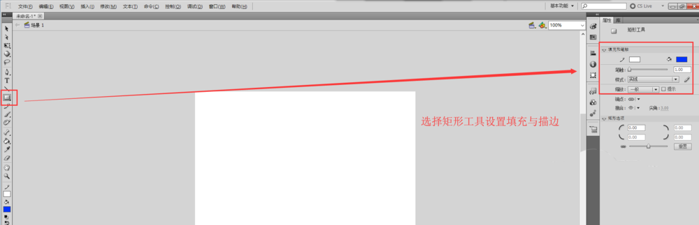2、選擇工具欄中的矩形工具,然后在屬性窗口中設(shè)置筆觸顏色與填充顏色等其他屬性參數(shù)。
