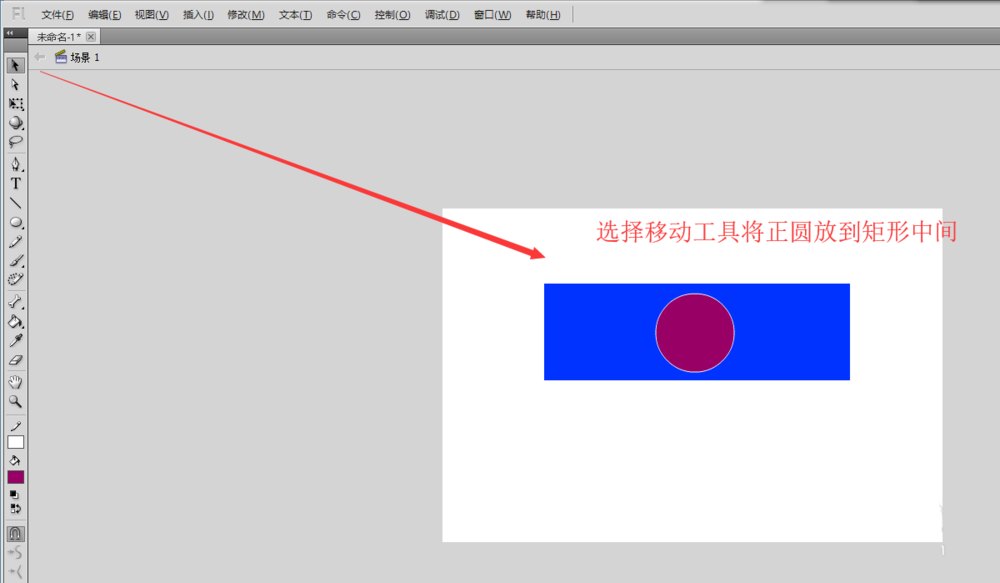 5、用選擇工具將正圓全部選中移到矩形圖形位置上,然后在舞臺(tái)空白處單擊取消選擇。