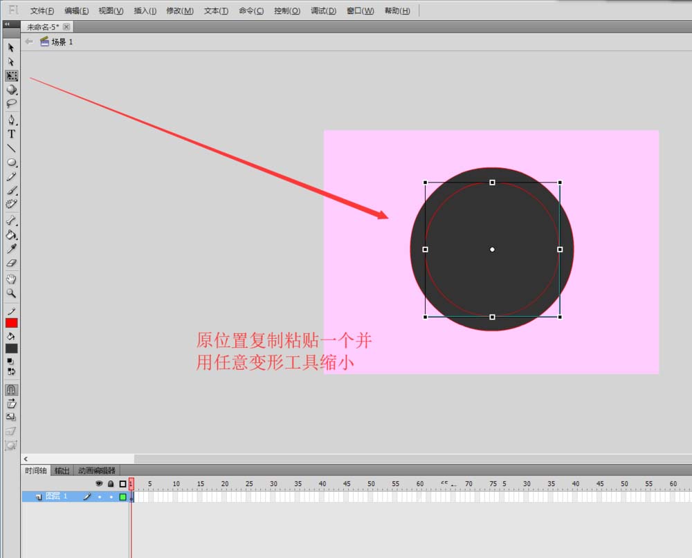 3、選中繪制的正圓,按Ctrl+C復制,然后Ctrl+Shift+V原位置粘貼,然后選擇任意變形工具,結合shift與alt鍵將復制的圖形縮小。