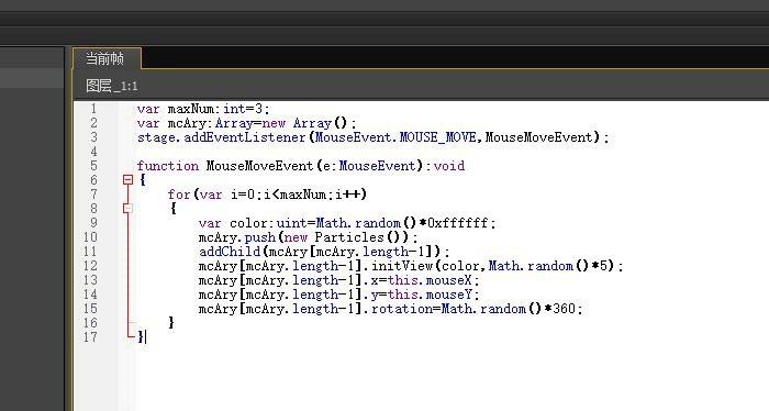 var maxNum:int=3;var mcAry:Array=new Array();stage.addEventListener(MouseEvent.MOUSE_MOVE,MouseMoveEvent);function MouseMoveEvent(e:MouseEvent):void{for(var i=0;i<maxNum;i++){var color:uint=Math.random()*0xffffff;mcAry.push(new Pflashs());addChild(mcAry[mcAry.length-1]);mcAry[mcAry.length-1].initView(color,Math.random()*5);mcAry[mcAry.length-1].x=this.mouseX;mcAry[mcAry.length-1].y=this.mouseY;mcAry[mcAry.length-1].rotation=Math.random()*360;}}