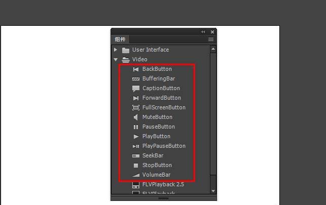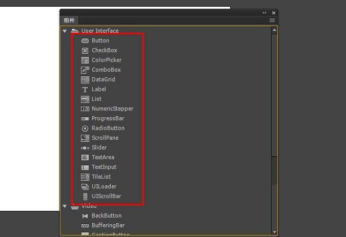 3、可以看到在Animate中,分成兩個(gè)文件夾,一個(gè)是User Interface,主要是按鈕、下拉條等常用組件,一個(gè)是Video是視頻播放相關(guān)的組件,比以前版本不同的是,以前的視頻播放組件沒(méi)有單獨(dú)的。