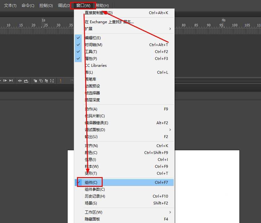 2、依次選擇菜單欄--窗口--組件,打開(kāi)組件面板。