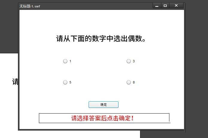 var right_index:int=3;var selected_index:int=-1;initSence();function initSence():void{for(var i:int=0;i<4;i++){this["l"+i].addEventListener(MouseEvent.CLICK,SelectEvent);}btn_submit.addEventListener(MouseEvent.CLICK,SubmitAnswer);}function SelectEvent(e:MouseEvent):void{var obj:Object=e.target;selected_index=int(obj.name.slice(1));}function SubmitAnswer(e:MouseEvent):void{if(selected_index==-1){txt.text="請(qǐng)選擇答案后點(diǎn)擊確定!";}else if(selected_index==right_index){txt.text="選擇正確!";}else{txt.text="選擇錯(cuò)誤!";}}