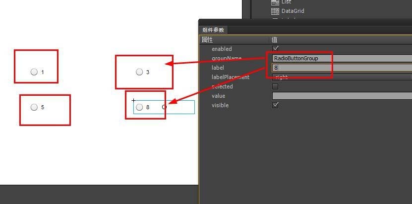 3、依次選擇四個(gè)組件,設(shè)置參數(shù)中Label為1,3,5,8