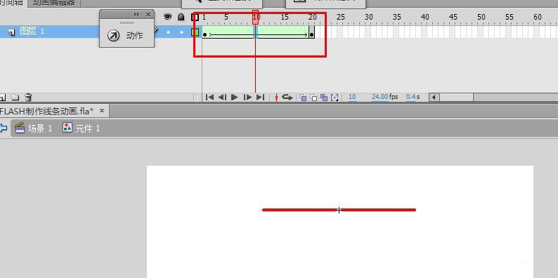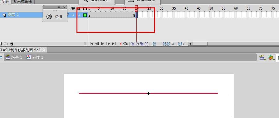 4、雙擊進入編輯狀態,延長幀到20幀,并添加關鍵幀。在第1幀,將直線長度調為10個像素,并居中。