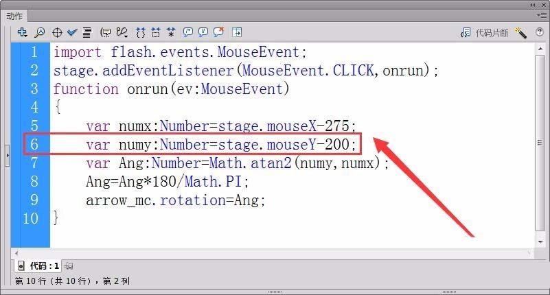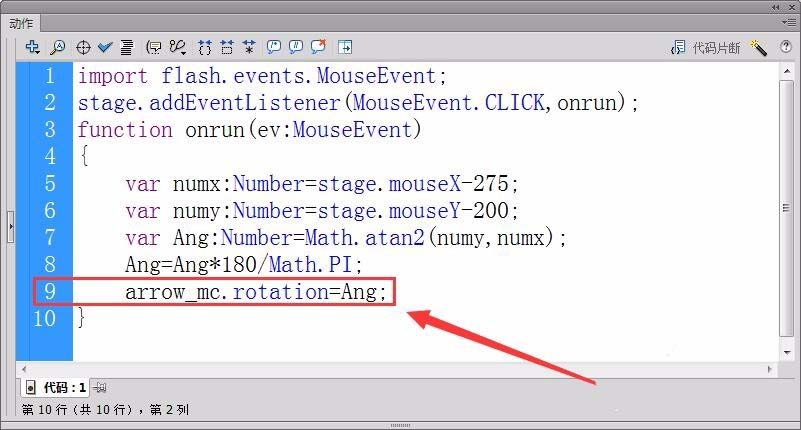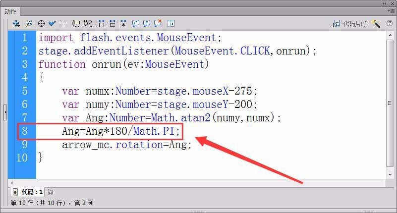 8、定義一個實型變量,保存鼠標相對于舞臺中心的角度值,用反正切函數Math.atan2計算角度值。