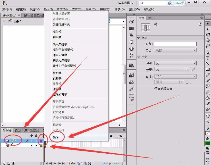 3、新建一個圖層命名為“代碼”,在圖層的第1幀右擊,選擇“動作”選項。