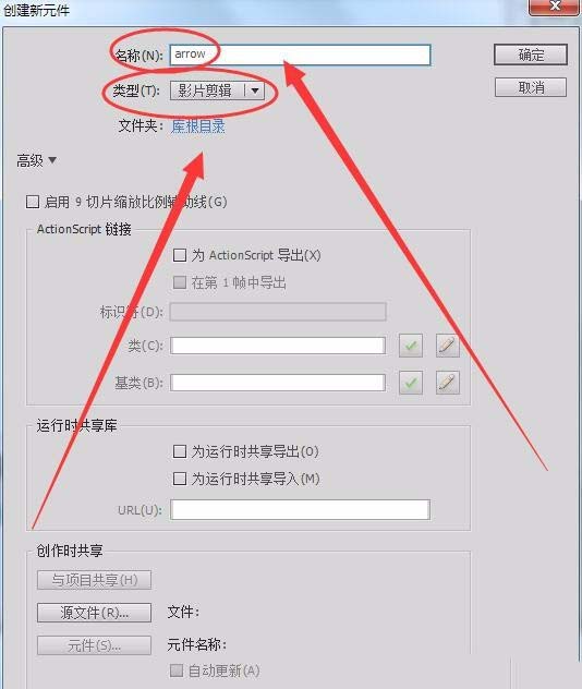 1、單擊“插入”---->“新建元件”,將元件“名稱”取名為arrow,“類型”為影片剪輯,在庫面板中新建一個繪有箭頭的影片剪輯元件。