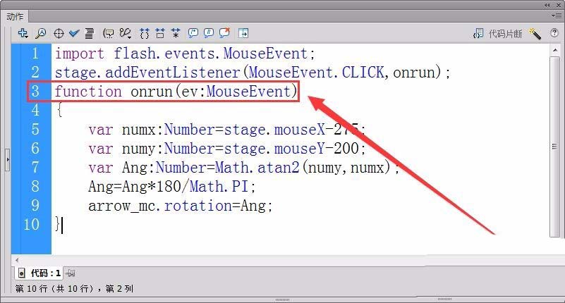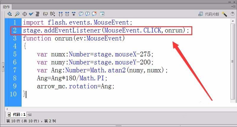 10、最后,在舞臺實現箭頭指向單擊鼠標所在的位置。