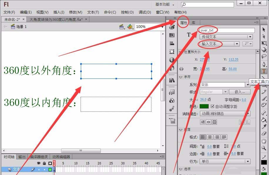 1、在“編輯欄”選擇“文本工具”,在舞臺中繪制一個輸入文本框,在屬性面板中,將“實例名稱”取名為“over_txt”。(注:要嵌入字體)