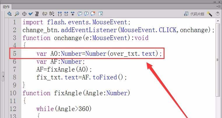 8、接著,在舞臺輸出轉換后的角度,函數toFixed()實現四舍五入取整,用屬性fix_txt.text輸出角度值。
