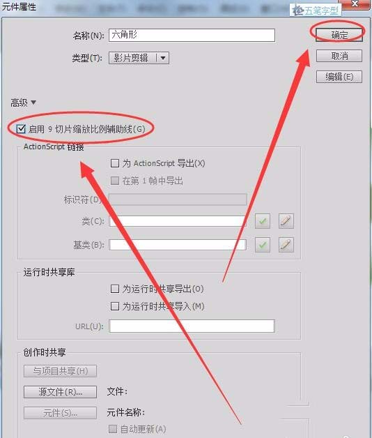 5、在“元件屬性”窗口中選擇“啟用9切片縮放比例輔助線”前的勾,單擊“確定”。