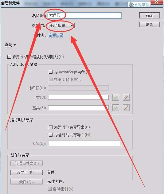 2、單擊“插入”---->“新建元件”,創建一個名為六角形的影片剪輯元件。