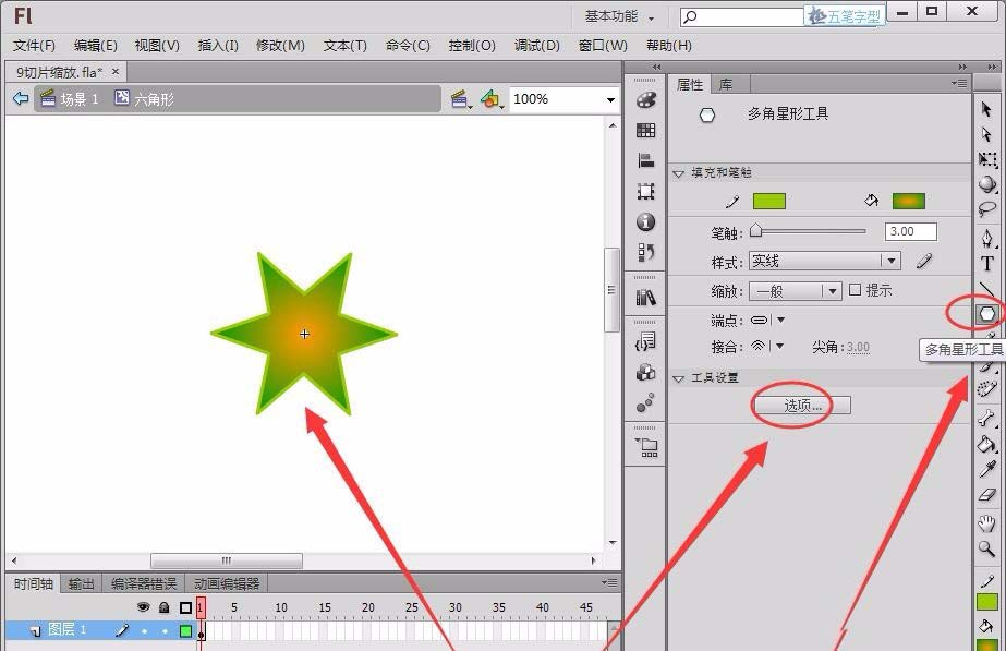 3、選擇“編輯欄”中的“多角星形工具”,在屬性面板中設置“選項”,繪制一個六角星形圖案。