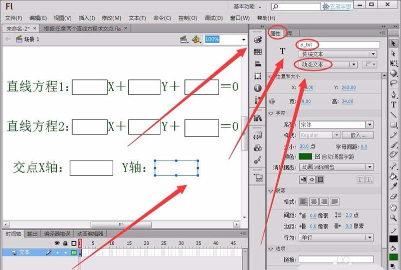 3、用“文本工具”在舞臺繪制2個動態文本框,用來輸出交點的X軸坐標和Y軸坐標,將實例名稱取名為“x_txt”和“y_txt”。