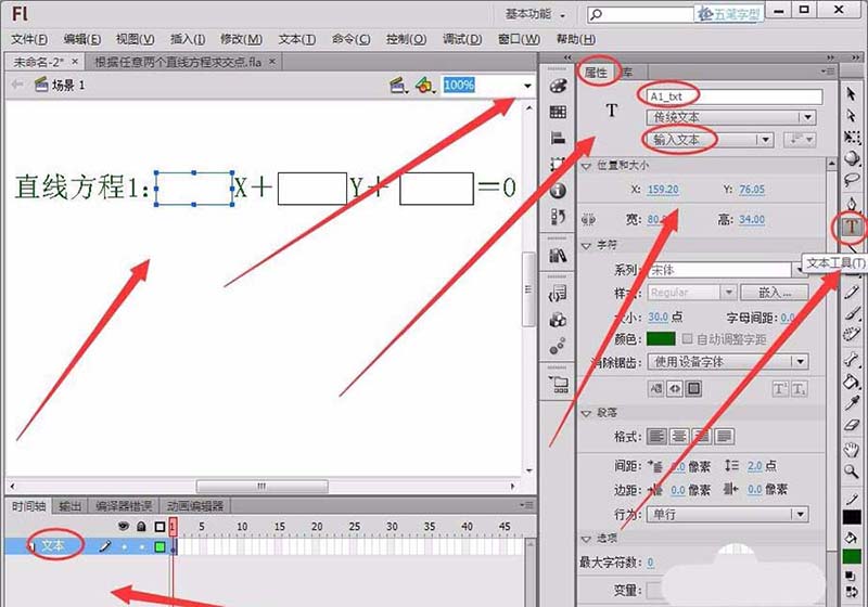 1、選擇“文本工具”,在舞臺輸入直線1的方程,設置3個輸入文本框,在“屬性”面板中將“實例名稱”取名為“A1_txt”、“B1_txt”和“C1_txt”。