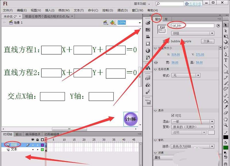 4、新建一個圖層“按鈕”,插入一個按鈕“計算”,在屬性面板中將實例名稱取名為“cal_btn”。