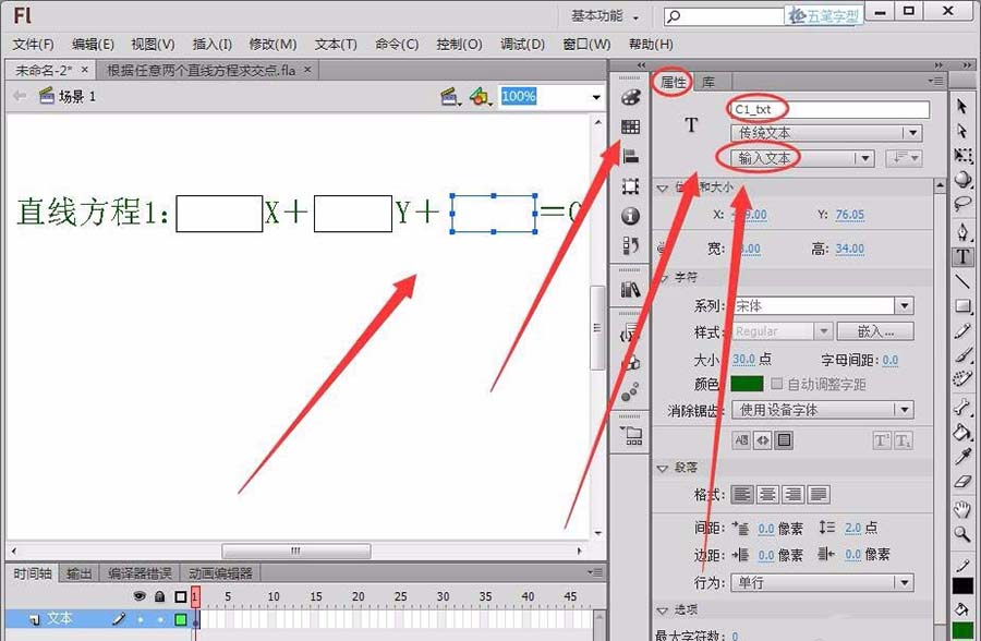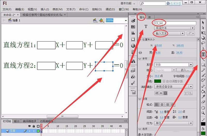 2、用上一步的方法,書寫直線2的方程,將3個輸入文本框的實例名稱取名為“A2_txt”、“B2_txt”和“C2_txt”。