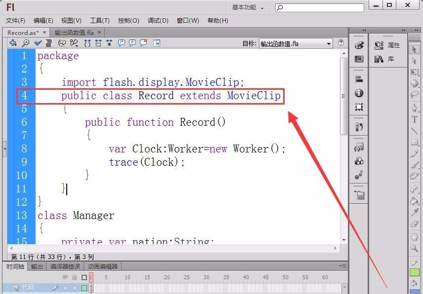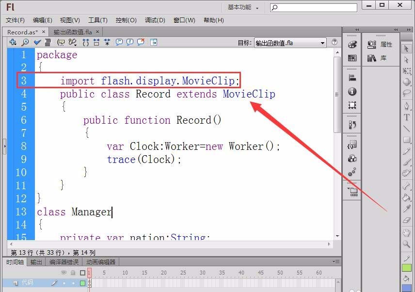 2、在類中,插入MovieClip類,代碼如下圖所示。